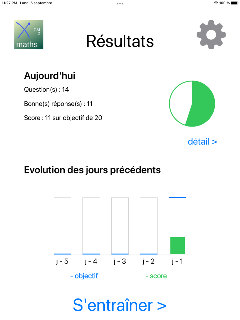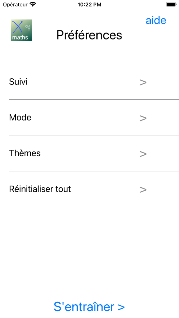 un menu préférences pour activer le suivi, donner des objectifs, sélectionner des thèmes et choisir un mode de difficulté entre mémoriser pour revoir le cours, appliquer des apprentissage sur des exercices simples, maîtriser les acquis et approfondir pour aller plus lois